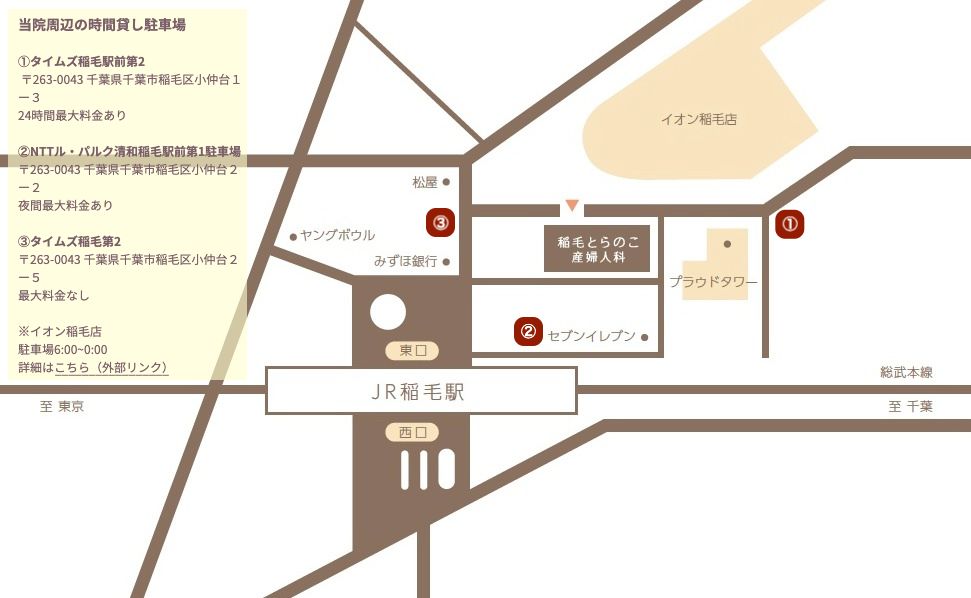 当院には有料駐車場(1, 2, 7番が当院駐車場)を併設しております(受診者割引がございます)が、台数に限りがございます。近隣にはコインパーキング、時間貸し駐車場がございます(当院での受診者割引はございませんのでご注意ください)。